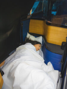 The bus has personal “suites” that are 5 feet by 3.3 feet, with 13.2 square feet of space. Each has two seats that can be left upright for office mode. One or both can be laid flat to make a bed that’s 6 and a half feet long and 40 inches wide, with a memory foam mattress. The suites have privacy screens and two fold-out desks.