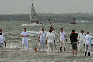 The Bramble Bank is a triangular sandbar located in the center of the Solent between Calshot in mainland Hampshire, England, and Cowes on the Isle of Wight. Through most of the year, the Bramble forms a patch of unusually shallow water, posing a perilous threat to the sea traffic using the busy strait. Once a year, however, it rises from the depths to become something “quintessentially English.” Typically in August, during the country’s lowest spring tide, and only then, the Bramble Bank emerges for just short of an hour, providing sports…