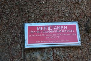 The Academic Quarter is a long-standing tradition in academia. Originally, it was created because church bells were the only means of keeping time. It was understood that students had 15 minutes to get to class after the clock chimed a certain hour. Today, it’s still maintained in many universities to give students some time to park and find their classrooms. A tradition like that requires a monument. In Lund, a plaque claims to mark the meridian that is exactly 1 hour and 15 minutes east of Greenwich, or 15 minutes…