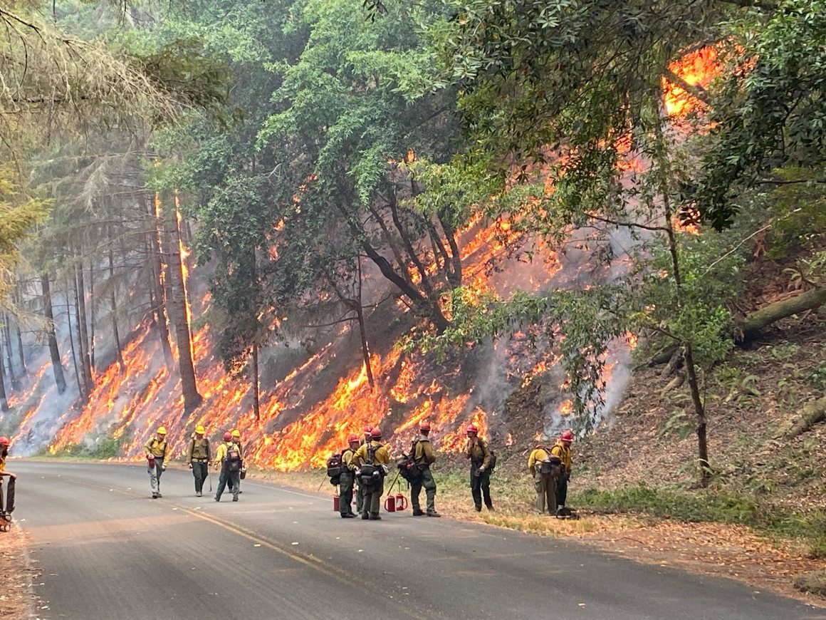 The ground was orange, and the sky was, too. Flame licked through the grass; the little fist of the sun, a gray cloud, and a jagged top of an evergreen were just barely visible through the smoke. The sloped sides of kotcas—triangular dwellings sometimes made of redwood—were visible in silhouette. These structures are part of Kule Loklo, a recreated Coast Miwok village that sits inside the Point Reyes National Seashore. Since a lightning strike on August 18, the Woodward Fire has burned its way through portions of Point Reyes, about…