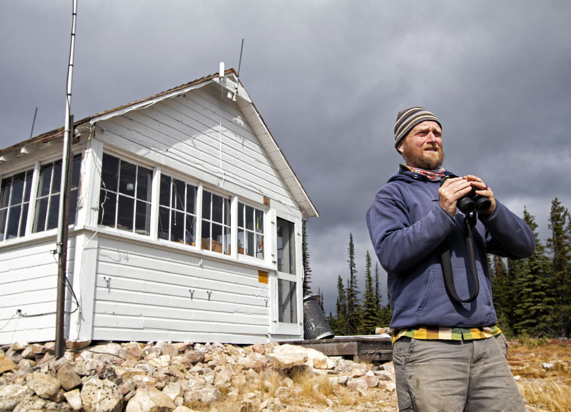 Low-hanging clouds occlude the mountains of nearby Glacier National Park as Leif Haugen drives his pickup truck down a rugged forest road in the predawn darkness. About 20 or so miles north of Polebridge, Montana, Haugen pulls over, lets his dog Ollie out, swings a pack on to his back, and starts hiking down an old logging road. A mile or so down, he spots a small pile of stones and turns into a thick forest for a 3.5-mile hike up to Thoma Lookout. This is Haugen’s commute. Thoma is…
