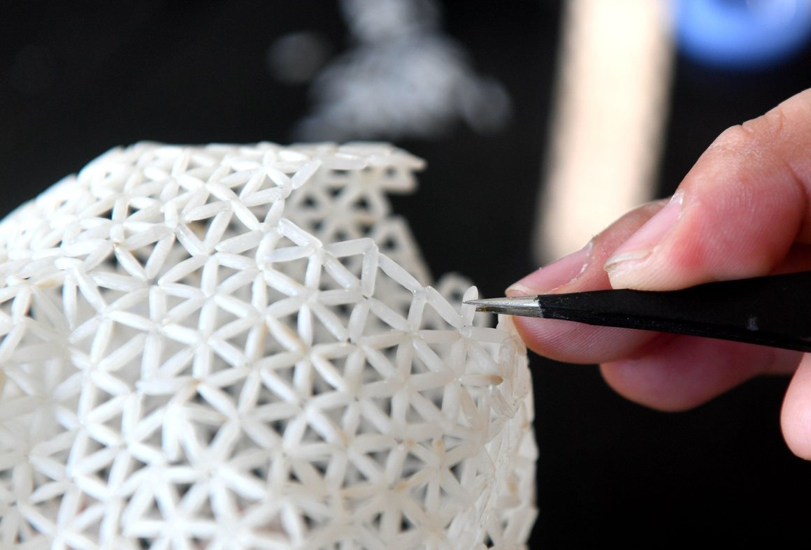 No one is pickier about rice than Guorui Chen. The 33 year old only accepts rice grains longer than 7 millimeters (1/4 inch), and they have to be white, clear, straight, and undamaged. Every day, he separates intact grains from broken ones with a winnowing basket and then spends hours examining their transparency under a light. But Chen won’t cook this rice. Instead, he turns it into art. He picks out three grains, glues them end to end into a triangle, and connects hundreds of these basic units to form…