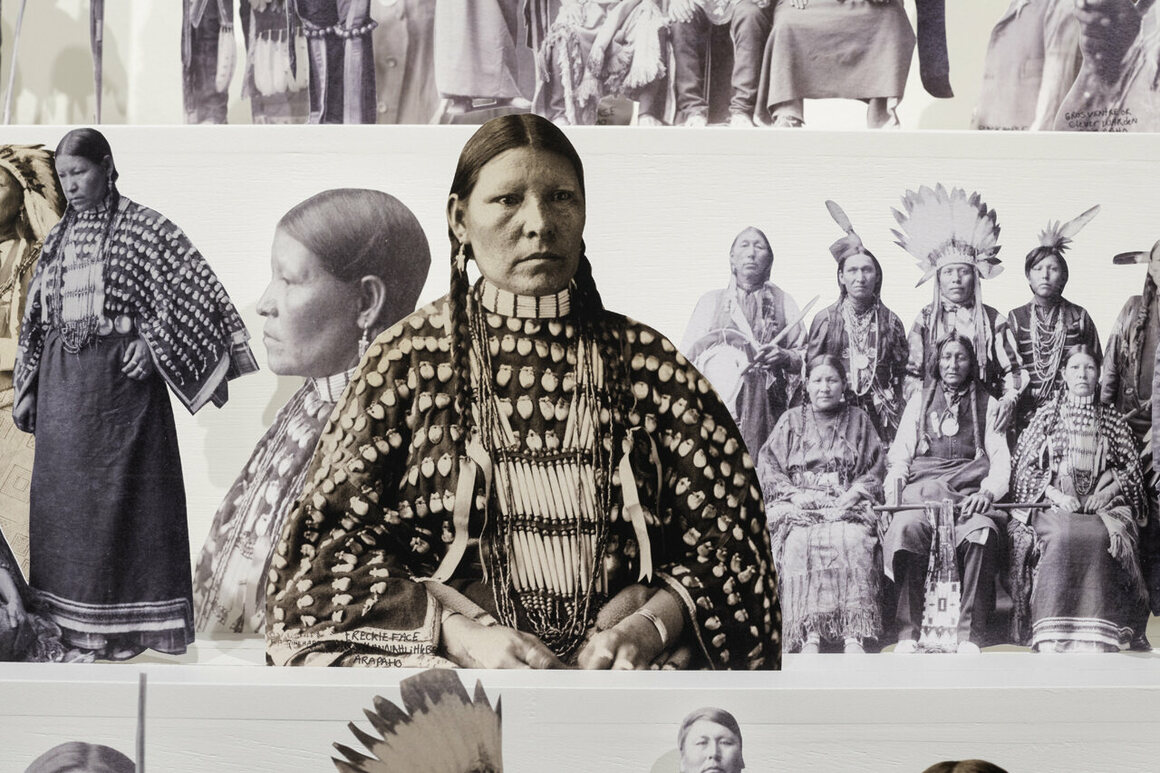 The man in the sepia photo, known as White Swan of the Crow nation, stands with a striped shirt and elaborate feathered headdress. With a hint of a smile on his face, his left hand palms a holstered pistol. Another image shows a woman of the Arapahoe nation, in a blouse richly decorated with neat rows of large, sewn-on beads. Yet another depicts Black Wezel of the Blackfoot nation, seated and sporting a Western-style suit and shirt, a round earring dangling off his left ear. They were all attendees of…