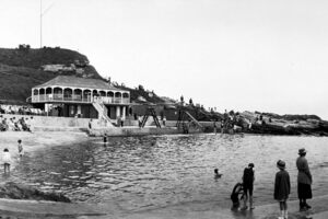 This site housed a pool from the late 19th century and remained open until the late 1980s. Initially there was just a pavilion for changing to allow use of a semi-natural pool filled by incoming tides but later developments enclosed the bay with concrete walls. On land extra facilities were installed including a ballroom and the pools were provided with slides and fountains. In 1928, a boating pond was added to the complex. After the pool was fully developed, a large rock in the middle of the bay called Doo…