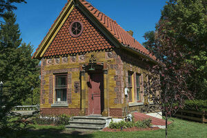 Now located in front of Alfred University, this small building is one of the most obvious reminders of the legacy of the Celadon Terra Cotta Company. The village of Alfred had existed for many decades before it was discovered that the clay found in its riverbeds was ideal for the making of terra cotta ceramics. In 1889, the Celadon Terra Cotta Company was founded by local residents and quickly grew into a large manufacturer of terra cotta products. In addition to bricks and roof tiles, the company made ornamental tiles…