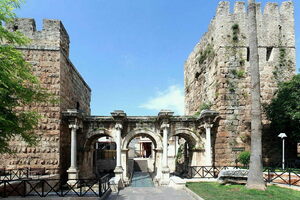 Hadrian’s Gate was built in 130 CE. A wall was subsequently built around the city’s old quarters (Kaleiçi) and the gate was incorporated into the design. Hadrian’s Gate can be classified as the typical Roman triumphal gate, with three archways of identical size. The total height of the gate is 26 feet (8 meters) and is composed of marble and granite. The two façades of the gate have four columns each. Floral decorations adorn the gate and stylized heads of lions dominate the upper portion. The two towers adjacent to…