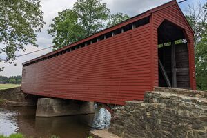 Named for an old rail station, this bridge was originally a single span but now features a pier at the midpoint. The bridge was constructed using a multiple kingpost design. It was added to the National Register of Historic Places in 1978. This bridge has taken a beating over the years. In 1991, an arsonist attempting to file a fraudulent insurance claim against the bridge parked a truck inside of it and set it ablaze. A huge outpouring of time and energy from the local community in the form of…