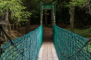 The Clarendon Gorge Bridge, also called the “Bob Brugmann Memorial Bridge” or simply the “swinging bridge” was built in the summer of 1975. It replaced an earlier bridge that had been built in 1957 and spanned the gorge at the same spot. (That bridge, also a cable-suspension type bridge, replaced a covered bridge which was built circa 1906.) On June 30, 1973, heavy rains had raised the level of the Mill River and washed the 1958 bridge away. On July 4, more rains again brought the river to near flood…