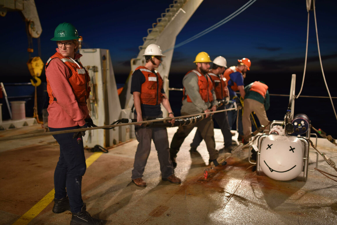 The research vessel bobbed in the southwestern Pacific like a toy boat in a bathtub. Three scientists watched numbers scroll across a monitor as the minutes ticked by on another 12-hour shift. The instruments collecting that raw data had been deployed days earlier in a line on the ocean floor. Now, the ship was towing a fish-shaped transmitter just above the seabed to pick up the remote devices’ signals and send them back to the vessel. Things were going well. Until they weren’t. “When you’re out at sea, you pray…