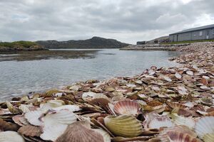 The island of Grimsay, in Scotland’s archipelago of the Outer Hebrides, is home to the community of Kallin (Ceallan in Gaelic). Kallin is one of the bases of Namara, a seafood company whose main business is based off the nearby island of North Uist. For the Kallin shop, scallops are among their best sellers, which is abundantly clear in the midden that surrounds their store. Middens are large collections of shells, which are discarded after the meat of the animals is consumed. The midden at Kallin is almost entirely made…
