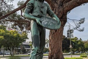 Surrounded by faux rocks and under a large, sprawling tree, the bronze statue of Daniel O’Connell McCarthy stands seven feet tall, and the plaque indicates it is a memorial to the pioneer spirit of the many thousands who, like McCarthy, tried their luck in the 1949 Gold Rush. Originally the statue was located near the Carthay Circle Theatre movie palace. When the theater was demolished in 1969, this statue was moved to Carthay Circle Park, little more than a triangular pocket park-cum traffic island at McCarthy Vista/San Vicente Boulevard. McCarthy…