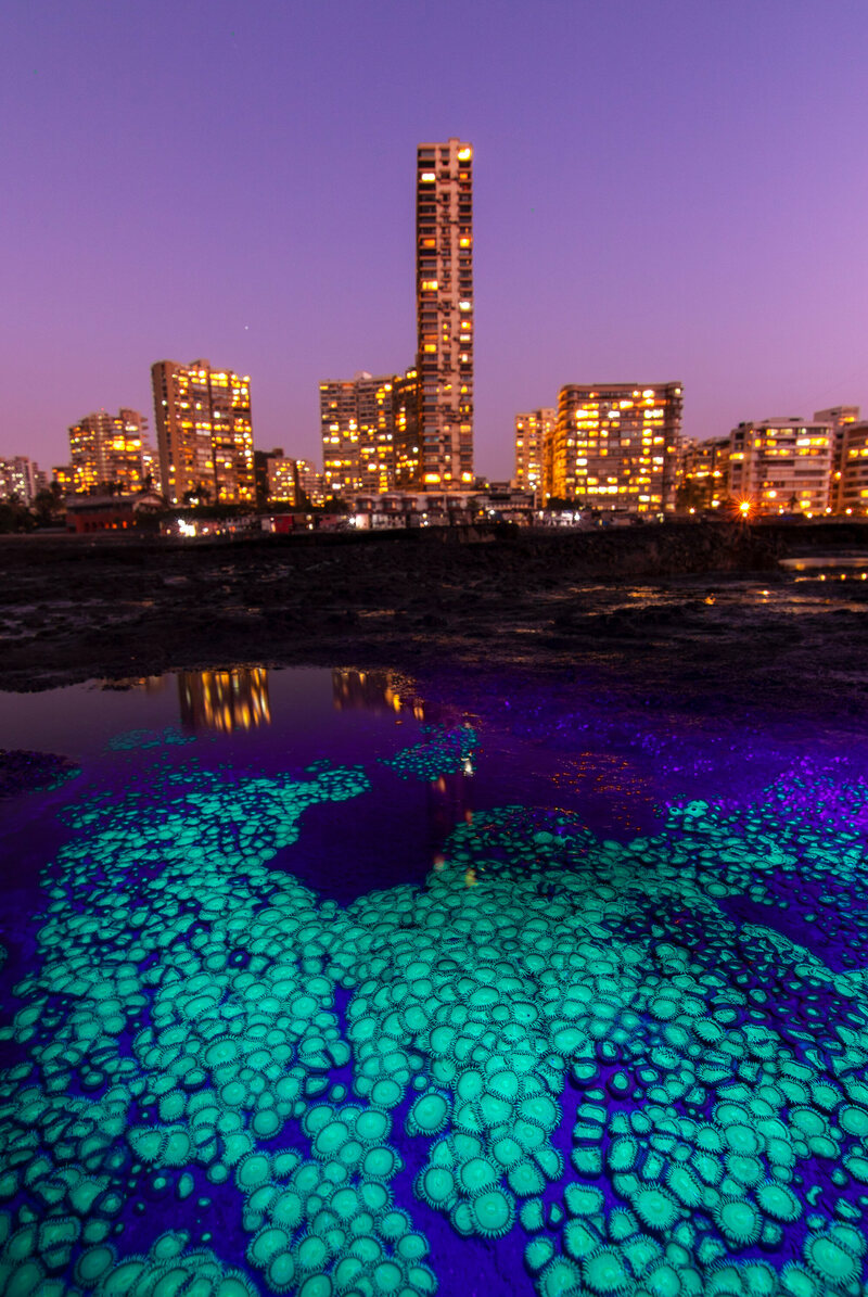 Bright pink flamingos saunter through shallows, some pausing to nibble algae and tiny invertebrates near the surface. The birds’ movement creates small ripples in the reflection of mustard-yellow apartment buildings rising behind them. In another image, shot at night, bioluminescent soft corals glow an otherworldly blue in the shadow of an urban skyline. For Mumbai-born photographer Sarang Naik, these shots capture “life just quietly going along” in and around a city of 20 million. Naik’s surprising, wondrous images of terrestrial wildlife have earned him accolades—a dynamic shot of a mushroom…