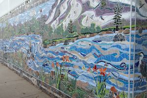 The North Creek Mosaic Project is the largest piece of public art in North Creek. It was conceived by local artist, Kate Hartley over 12 years ago. Work went on for years and was finally completed in 2020 and consisted of well over 700 volunteers. The mosaic is comprised of four, 60 foot long by 10 foot high panels of tile and glass depicting a stylized early spring day in North Creek. The mural showcases people enjoying outdoor activities such as skiing, hiking, rafting, and kayaking. Also depicted are native…
