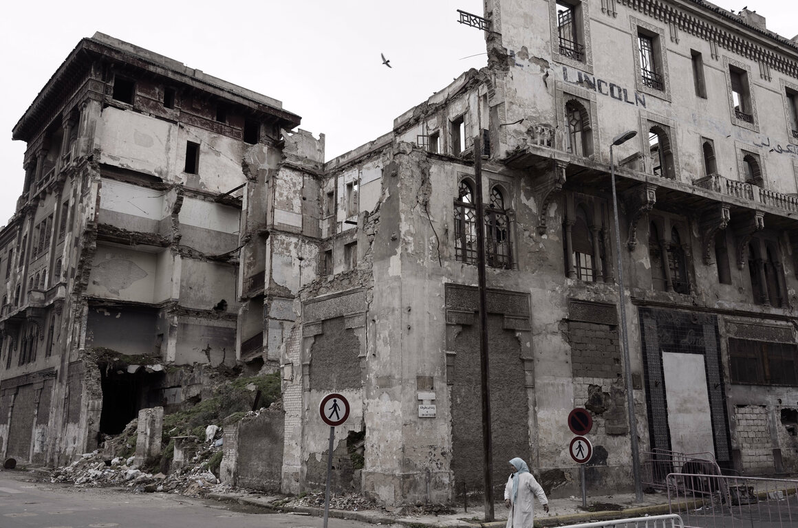 In downtown Casablanca, Morocco, next to the city’s new modern tram line and across from the white arcades of the Marche Central, a building seems to hang in midair. Without a foundation, interior, or roof, the crumbling, brown brick facade floats in space, retaining a strange elegance despite the bristling metal scaffolding that holds it up. On this Saturday morning, a local woman in her fifties, dressed in a yellow-and-purple shirt and armed with a binder, explains the mystery to a tour group of Casablancans, or Casaouis. The guide is…