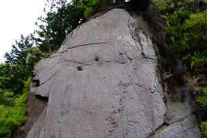 Along Route 299 in the township of Kanna stands a wall of mountain cliff known as the Sazanami-iwa (“ripple rock”). Discovered in 1953 during the construction of a road, it was initially believed to be just that—a rock with ancient ripple marks; but it later turned out to be something much more. Often referred to as the “ripple marks of Sebayashi” after the former village it is located in, the rock was thoroughly researched by Gunma University upon its discovery. When its team of academics made a report, it mentioned “strange…