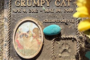Former internet meme icon ‘Grumpy Cat’—originally named Tardar Sauce—is buried at the Sunland Pet Rest Cemetery in Sun City, Arizona. Laid to rest alongside fellow furry and feathered friends, Grumpy Cat is honored with a headstone that includes the hashtag #grumpyforever….